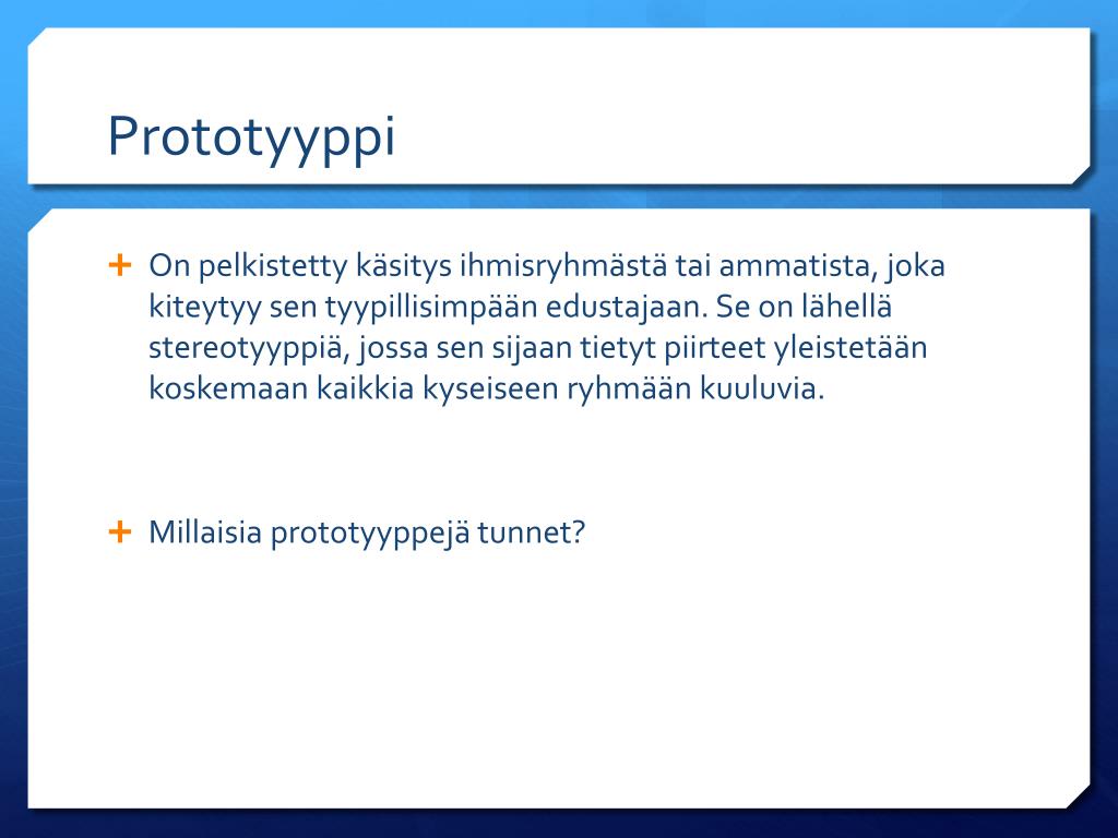Prototyyppi • On pelkistetty käsitys ihmisryhmästä tai ammatista, joka kiteytyy sen tyypillisimpään edustajaan. Se on lähellä stereotyyppiä, jossa sen sijaan tietyt piirteet yleistetään koskemaan kaikkia kyseiseen ryhmään kuuluvia. • Millaisia prototyyppejä tunnet?