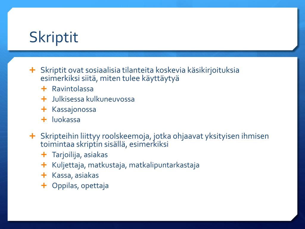 Skriptit • Skriptit ovat sosiaalisia tilanteita koskevia käsikirjoituksia esimerkiksi siitä, miten tulee käyttäytyä • Ravintolassa • Julkisessa kulkuneuvossa • Kassajonossa • luokassa • Skripteihin liittyy roolskeemoja, jotka ohjaavat yksityisen ihmisen toimintaa skriptin sisällä, esimerkiksi • Tarjoilija, asiakas • Kuljettaja, matkustaja, matkalipuntarkastaja • Kassa, asiakas • Oppilas, opettaja