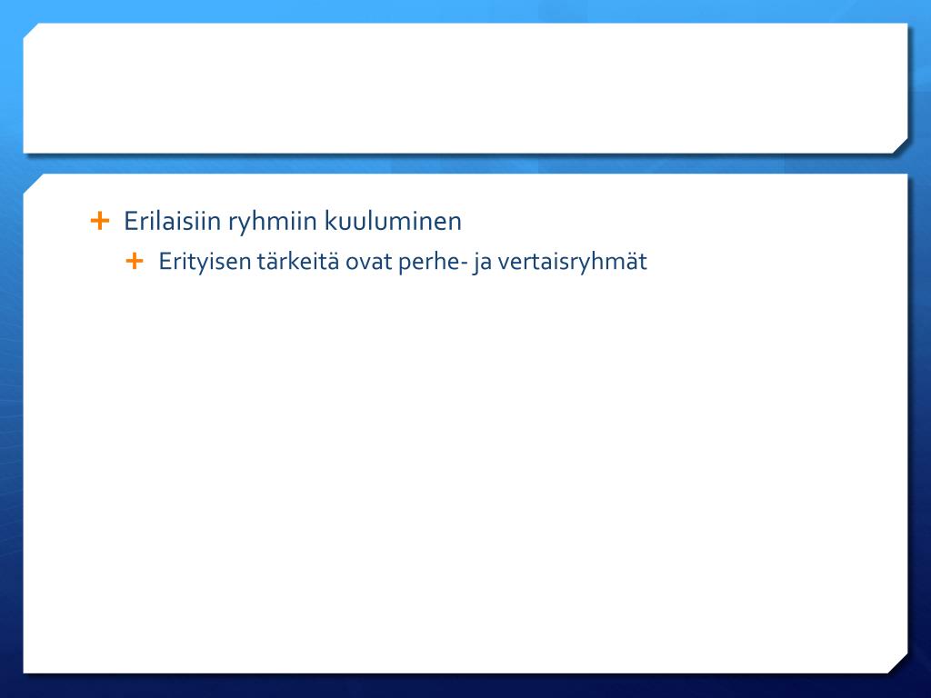Erilaisiin ryhmiin kuuluminen • Erityisen tärkeitä ovat perhe- ja vertaisryhmät