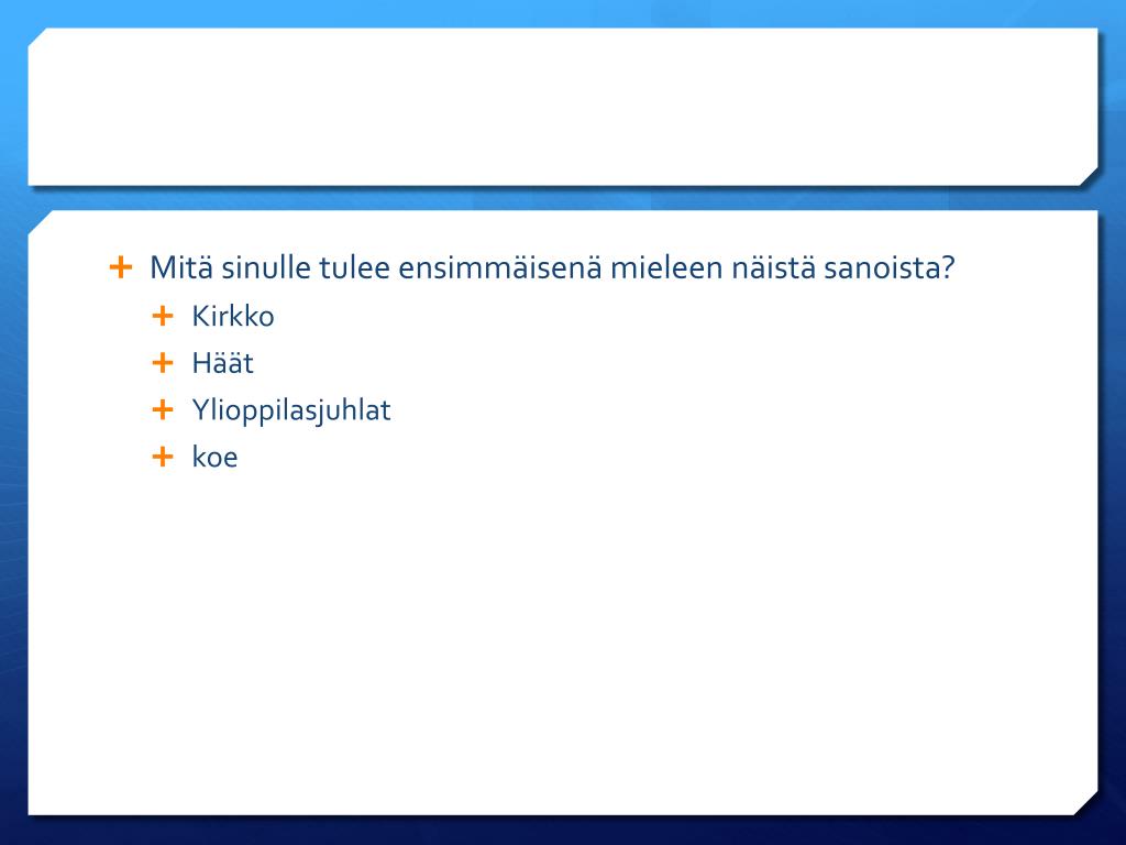Mitä sinulle tulee ensimmäisenä mieleen näistä sanoista? • Kirkko • Häät • Ylioppilasjuhlat • koe