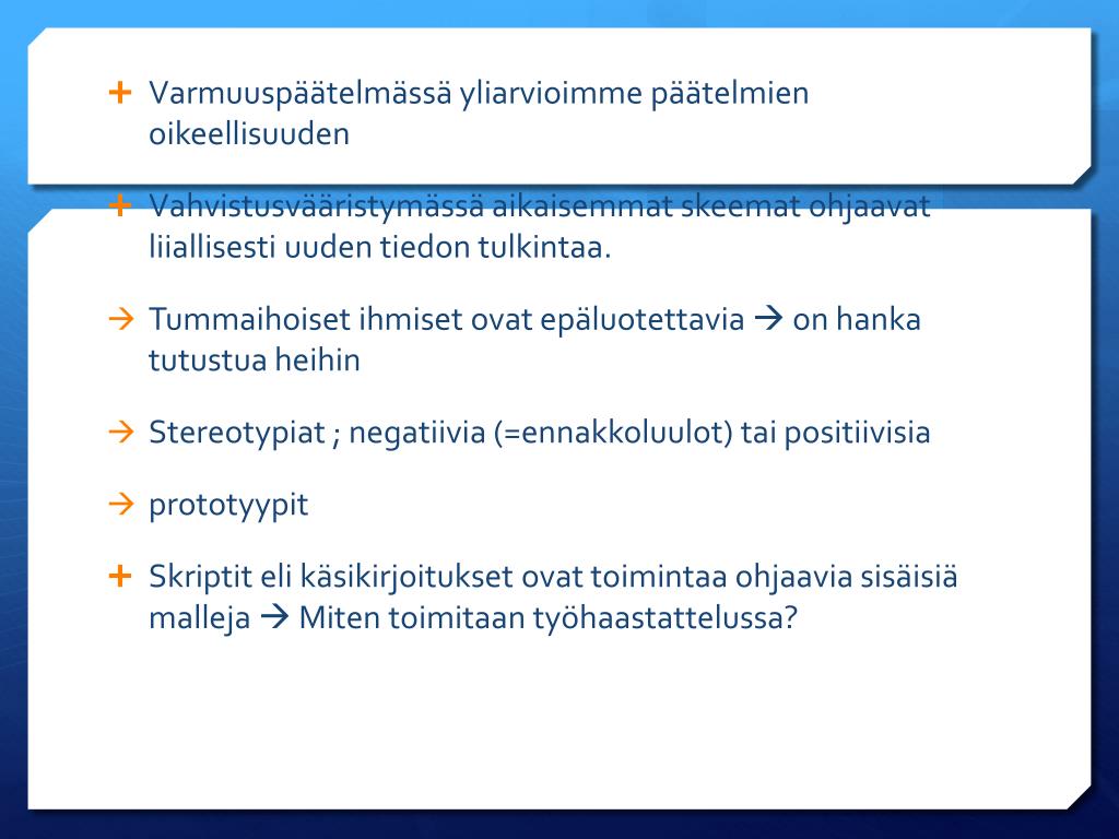 Varmuuspäätelmässä yliarvioimme päätelmien oikeellisuuden • Vahvistusvääristymässä aikaisemmat skeemat ohjaavat liiallisesti uuden tiedon tulkintaa. • Tummaihoiset ihmiset ovat epäluotettavia on hanka tutustua heihin • Stereotypiat ; negatiivia (=ennakkoluulot) tai positiivisia • prototyypit • Skriptit eli käsikirjoitukset ovat toimintaa ohjaavia sisäisiä malleja Miten toimitaan työhaastattelussa?