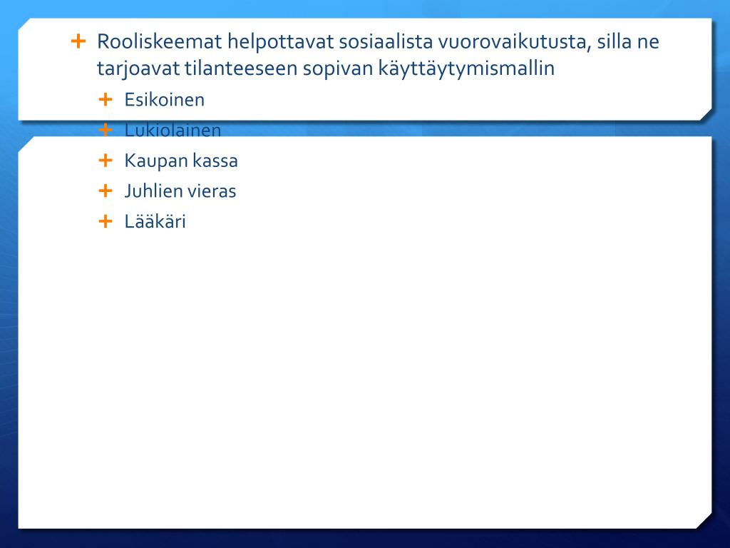 Rooliskeemat helpottavat sosiaalista vuorovaikutusta, silla ne tarjoavat tilanteeseen sopivan käyttäytymismallin • Esikoinen • Lukiolainen • Kaupan kassa • Juhlien vieras • Lääkäri