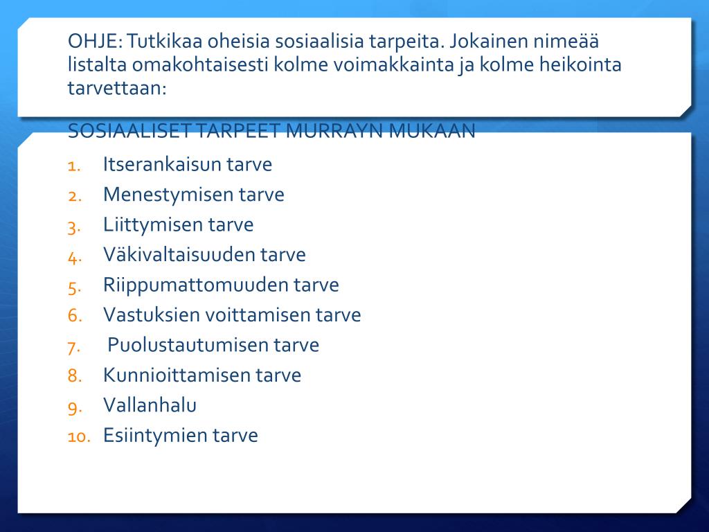 OHJE: Tutkikaa oheisia sosiaalisia tarpeita. Jokainen nimeää listalta omakohtaisesti kolme voimakkainta ja kolme heikointa tarvettaan: SOSIAALISET TARPEET MURRAYN MUKAAN • Itserankaisun tarve • Menestymisen tarve • Liittymisen tarve • Väkivaltaisuuden tarve • Riippumattomuuden tarve • Vastuksien voittamisen tarve • Puolustautumisen tarve • Kunnioittamisen tarve • Vallanhalu • Esiintymien tarve