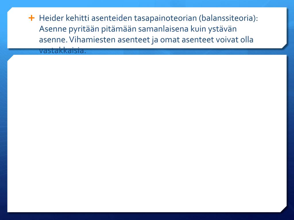 Heider kehitti asenteiden tasapainoteorian (balanssiteoria): Asenne pyritään pitämään samanlaisena kuin ystävän asenne. Vihamiesten asenteet ja omat asenteet voivat olla vastakkaisia.