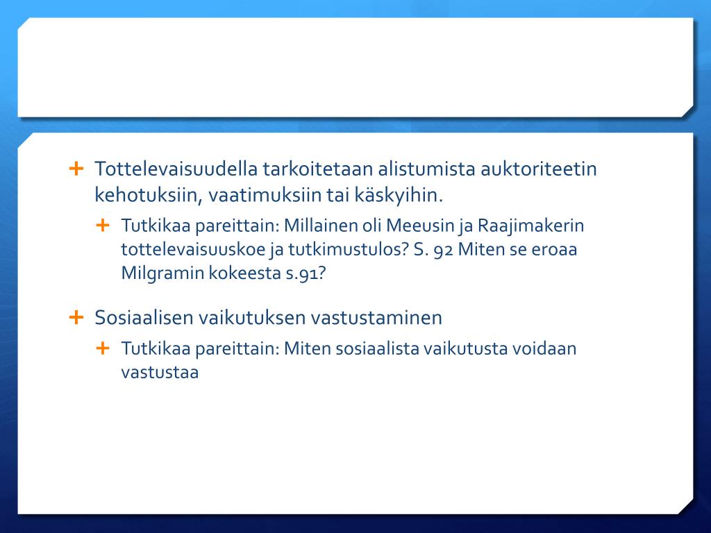 Tottelevaisuudella tarkoitetaan alistumista auktoriteetin kehotuksiin, vaatimuksiin tai käskyihin. • Tutkikaa pareittain: Millainen oli Meeusin ja Raajimakerin tottelevaisuuskoe ja tutkimustulos? S. 92 Miten se eroaa Milgramin kokeesta s.91? • Sosiaalisen vaikutuksen vastustaminen • Tutkikaa pareittain: Miten sosiaalista vaikutusta voidaan vastustaa