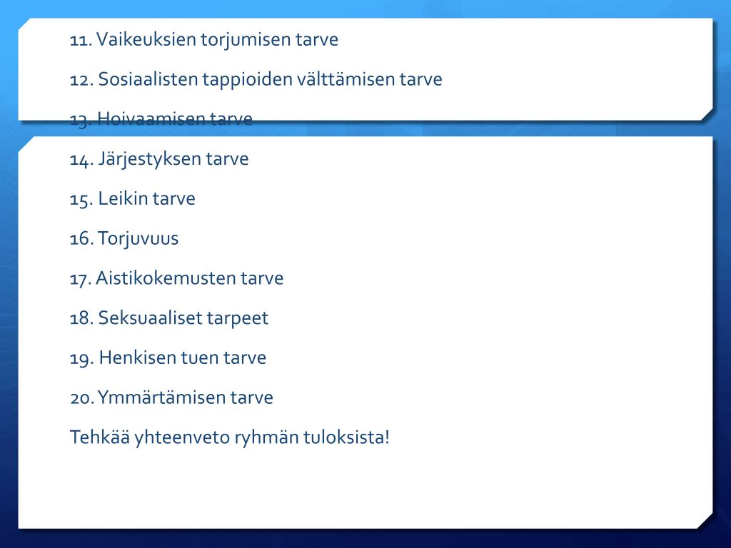 11. Vaikeuksien torjumisen tarve 12. Sosiaalisten tappioiden välttämisen tarve 13. Hoivaamisen tarve 14. Järjestyksen tarve 15. Leikin tarve 16. Torjuvuus 17. Aistikokemusten tarve 18. Seksuaaliset tarpeet 19. Henkisen tuen tarve 20. Ymmärtämisen tarve Tehkää yhteenveto ryhmän tuloksista!