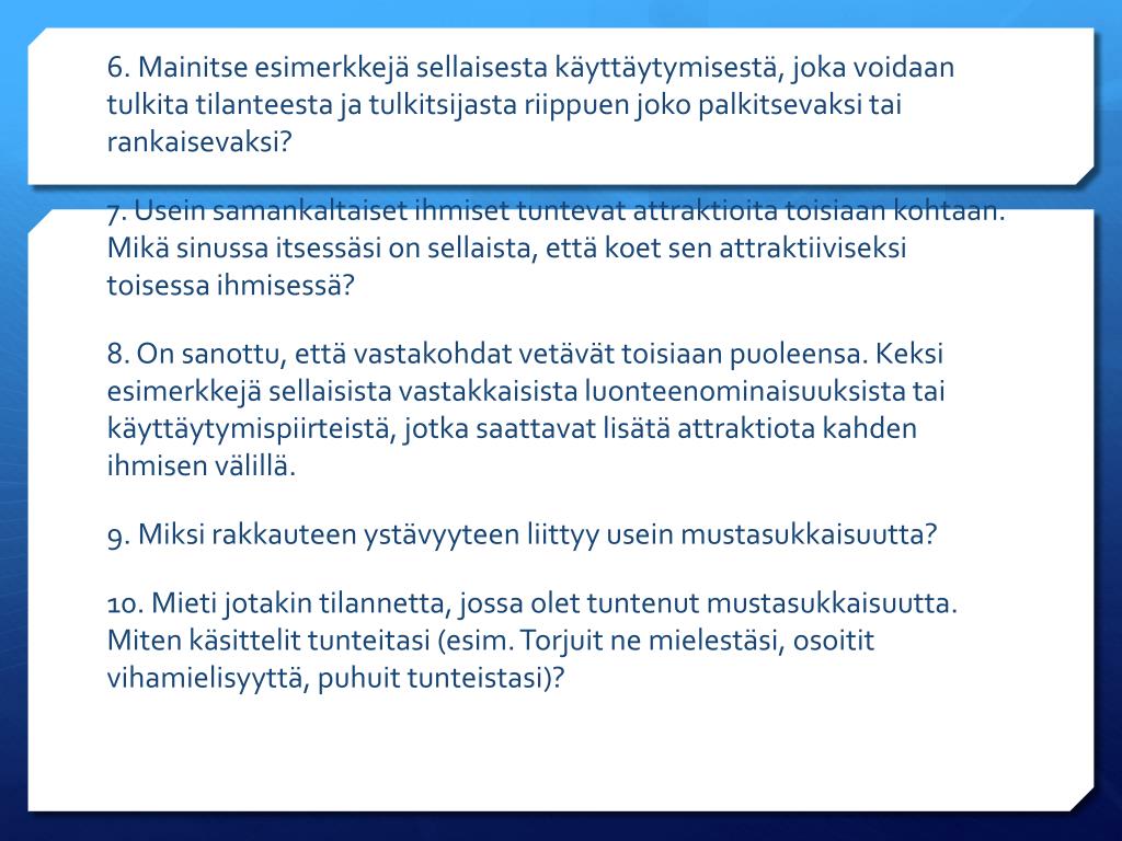 6. Mainitse esimerkkejä sellaisesta käyttäytymisestä, joka voidaan tulkita tilanteesta ja tulkitsijasta riippuen joko palkitsevaksi tai rankaisevaksi? 7. Usein samankaltaiset ihmiset tuntevat attraktioita toisiaan kohtaan. Mikä sinussa itsessäsi on sellaista, että koet sen attraktiiviseksi toisessa ihmisessä? 8. On sanottu, että vastakohdat vetävät toisiaan puoleensa. Keksi esimerkkejä sellaisista vastakkaisista luonteenominaisuuksista tai käyttäytymispiirteistä, jotka saattavat lisätä attraktiota kahden ihmisen välillä. 9. Miksi rakkauteen ystävyyteen liittyy usein mustasukkaisuutta? 10. Mieti jotakin tilannetta, jossa olet tuntenut mustasukkaisuutta. Miten käsittelit tunteitasi (esim. Torjuit ne mielestäsi, osoitit vihamielisyyttä, puhuit tunteistasi)?