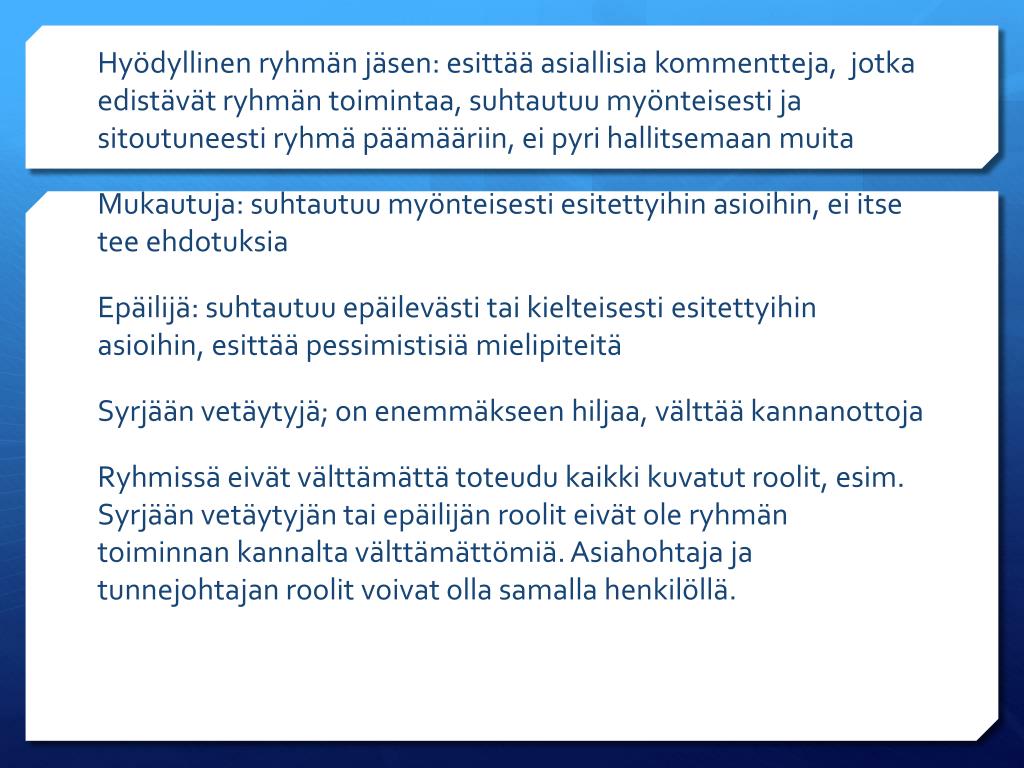 Hyödyllinen ryhmän jäsen: esittää asiallisia kommentteja, jotka edistävät ryhmän toimintaa, suhtautuu myönteisesti ja sitoutuneesti ryhmä päämääriin, ei pyri hallitsemaan muita Mukautuja: suhtautuu myönteisesti esitettyihin asioihin, ei itse tee ehdotuksia Epäilijä: suhtautuu epäilevästi tai kielteisesti esitettyihin asioihin, esittää pessimistisiä mielipiteitä Syrjään vetäytyjä; on enemmäkseen hiljaa, välttää kannanottoja Ryhmissä eivät välttämättä toteudu kaikki kuvatut roolit, esim. Syrjään vetäytyjän tai epäilijän roolit eivät ole ryhmän toiminnan kannalta välttämättömiä. Asiahohtaja ja tunnejohtajan roolit voivat olla samalla henkilöllä.