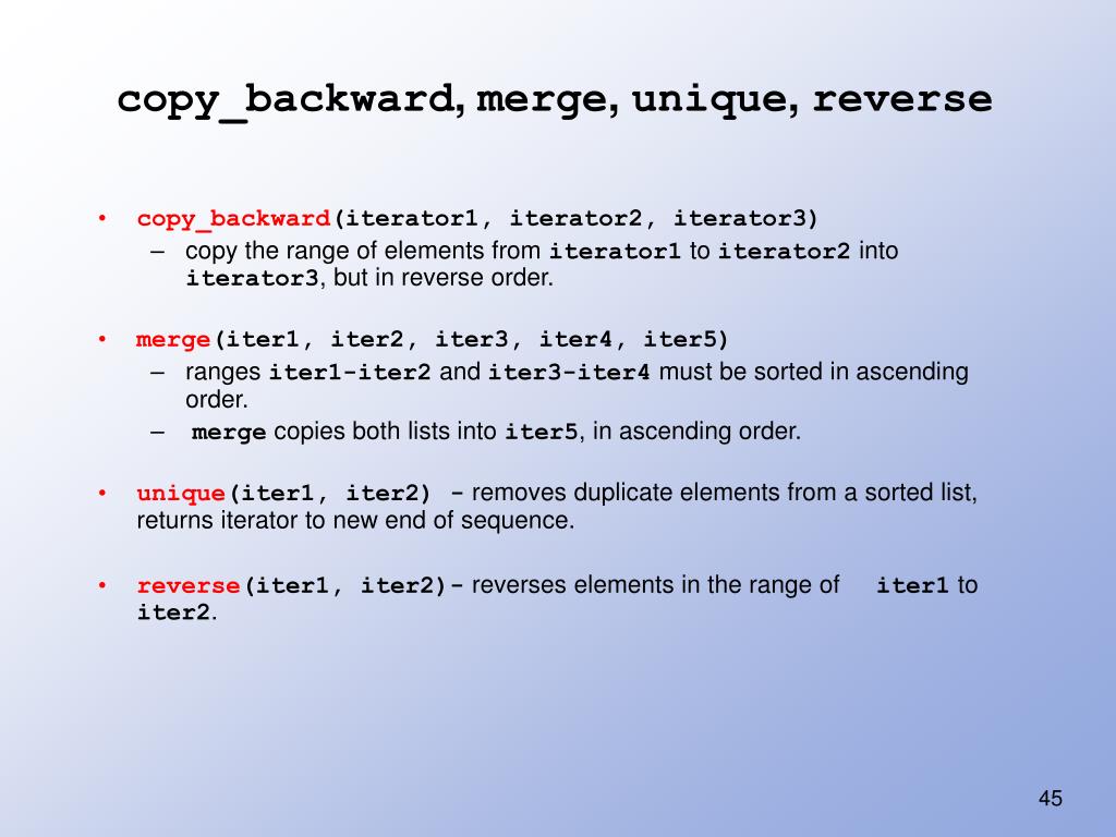 copy_backward, merge, unique, reverse • copy_backward(iterator1, iterator2, iterator3) • copy the range of elements fromiterator1 to iterator2 into iterator3, but in reverse order. • merge(iter1, iter2, iter3, iter4, iter5) • ranges iter1-iter2 and iter3-iter4 must be sorted in ascending order. • merge copies both lists into iter5, in ascending order. • unique(iter1, iter2) - removes duplicate elements from a sorted list, returns iterator to new end of sequence. • reverse(iter1, iter2)- reverses elements in the range of iter1 to iter2.