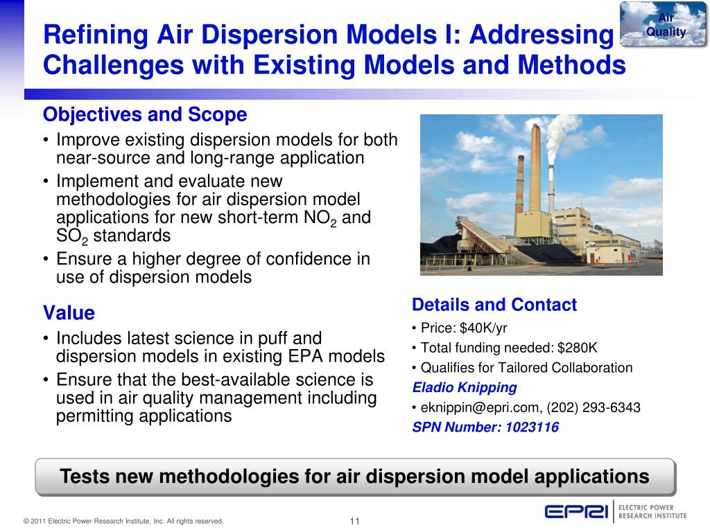 Objectives and Scope Improve existing dispersion models for both near-source and long-range application Implement and evaluate new methodologies for air dispersion model applications for new short-term NO2 and SO2 standards Ensure a higher degree of confidence in use of dispersion models Value Includes latest science in puff and dispersion models in existing EPA models Ensure that the best-available science is used in air quality management including permitting applications Details and Contact Price: $40K/yr Total funding needed: $280K Qualifies for Tailored Collaboration Eladio Knipping eknippin@epri.com, (202) 293-6343 SPN Number: 1023116 Refining Air Dispersion Models I: Addressing Challenges with Existing Models and Methods AirQuality Tests new methodologies for air dispersion model applications