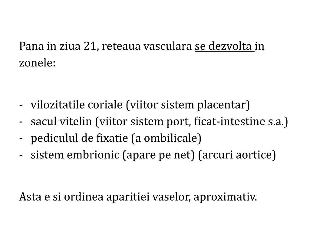 Pana in ziua 21, reteauavascularase dezvoltain zonele: • vilozitatilecoriale (viitorsistemplacentar) • saculvitelin (viitorsistem port, ficat-intestine s.a.) • pediculul de fixatie (a ombilicale) • sistemembrionic (aparepe net) (arcuriaortice) • Asta e siordineaaparitieivaselor, aproximativ.