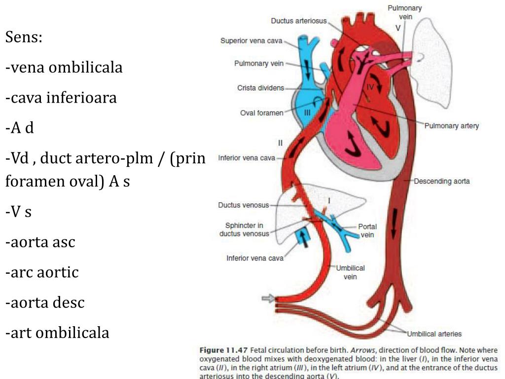 Sens: • vena ombilicala • cava inferioara • A d • Vd , duct artero-plm / (prin foramen oval) A s • V s • aorta asc • arc aortic • aorta desc • art ombilicala