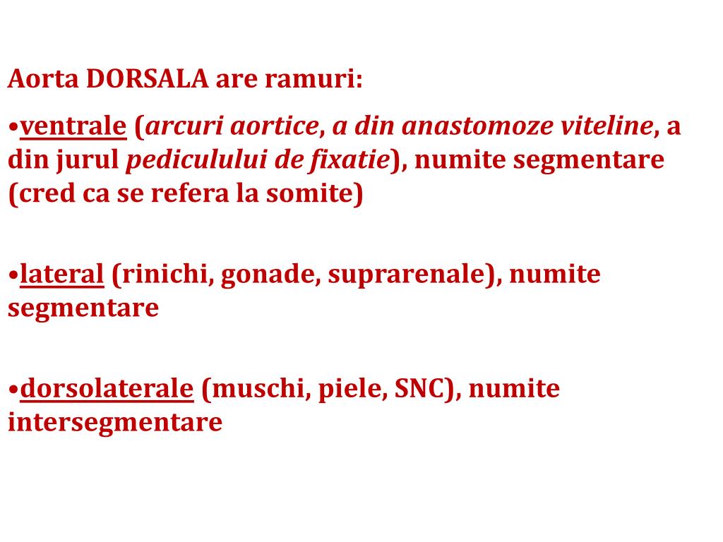 Aorta DORSALA are ramuri: • ventrale (arcuri aortice, a din anastomoze viteline, a din jurul pediculului de fixatie), numite segmentare (cred ca se refera la somite) • lateral (rinichi, gonade, suprarenale), numite segmentare • dorsolaterale (muschi, piele, SNC), numite intersegmentare