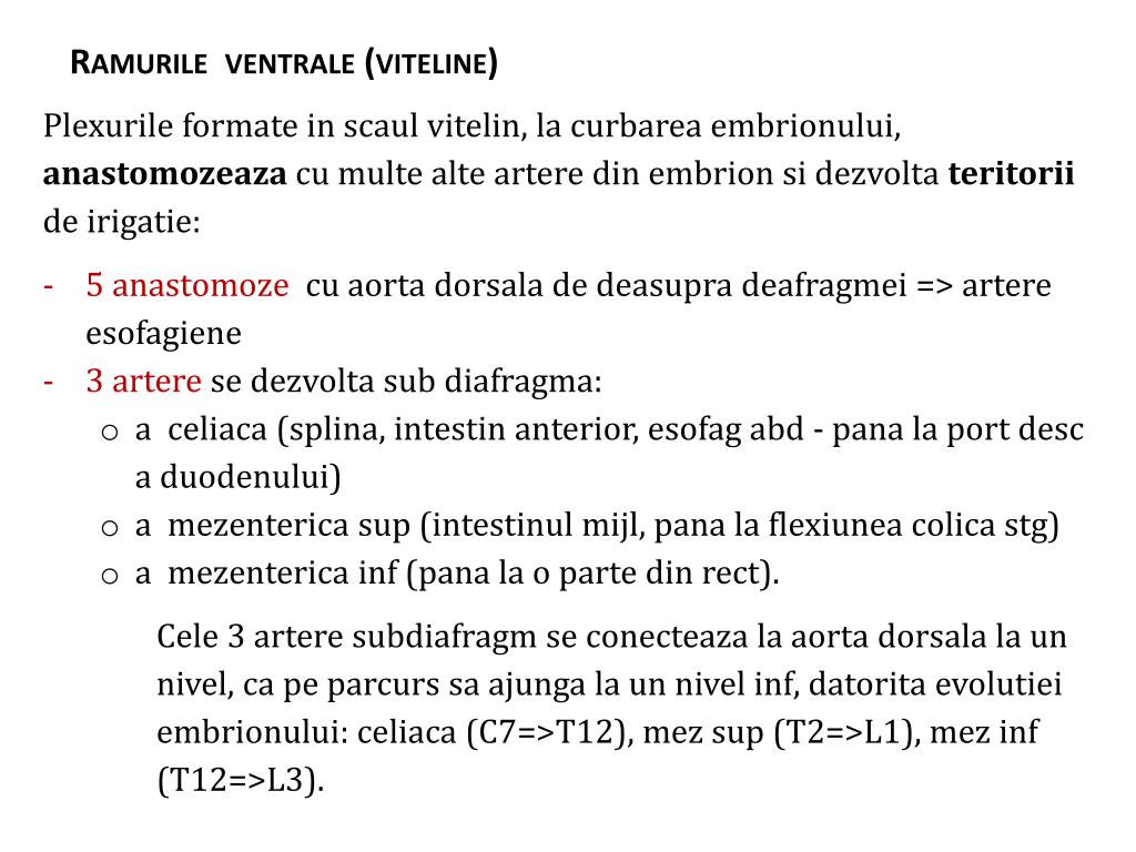 Ramurileventrale (viteline) • Plexurileformate in scaulvitelin, la curbareaembrionului, anastomozeaza cu multealteartere din embrionsidezvoltateritorii de irigatie: • 5 anastomozecu aorta dorsala de deasupradeafragmei => artereesofagiene • 3 arterese dezvolta sub diafragma: • a celiaca (splina, intestin anterior, esofagabd - pana la port desc a duodenului) • a mezenterica sup (intestinulmijl, pana la flexiuneacolicastg) • a mezentericainf (pana la o parte din rect). • Cele 3 arteresubdiafragm se conecteaza la aorta dorsala la un nivel, ca peparcurssaajunga la un nivelinf, datoritaevolutieiembrionului: celiaca (C7=>T12), mez sup (T2=>L1), mezinf (T12=>L3).