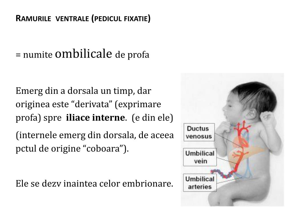 Ramurileventrale (pediculfixatie) = numiteombilicalede profa Emerg din a dorsala un timp, darorigineaeste “derivata” (exprimareprofa) spreiliace interne. (e din ele) (interneleemerg din dorsala, de aceeapctul de origine “coboara”). Ele se dezvinainteacelorembrionare.