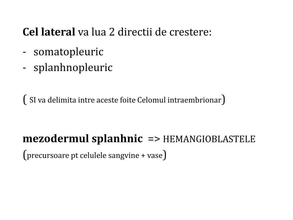 Cel lateral valua 2 directii de crestere: • somatopleuric • splanhnopleuric • ( SI vadelimitaintreacestefoiteCelomulintraembrionar) • mezodermulsplanhnic=> HEMANGIOBLASTELE (precursoare pt celulelesangvine + vase)