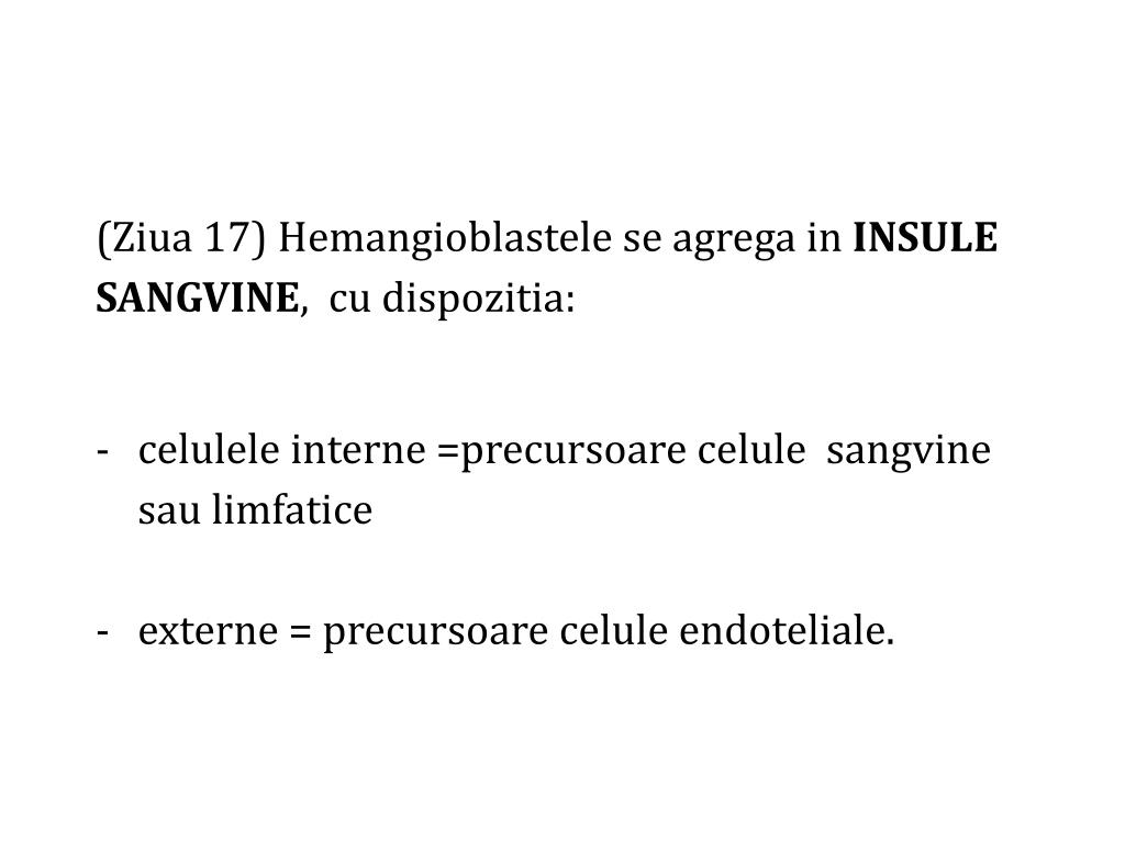 (Ziua 17) Hemangioblastele se agrega in INSULE SANGVINE, cu dispozitia: • celulele interne =precursoarecelulesangvinesaulimfatice • externe = precursoareceluleendoteliale.