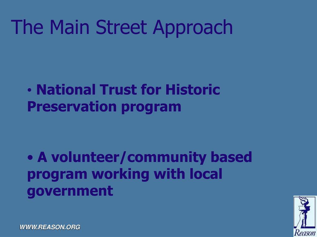 The Main Street Approach • National Trust for Historic Preservation program • A volunteer/community based program working with local government