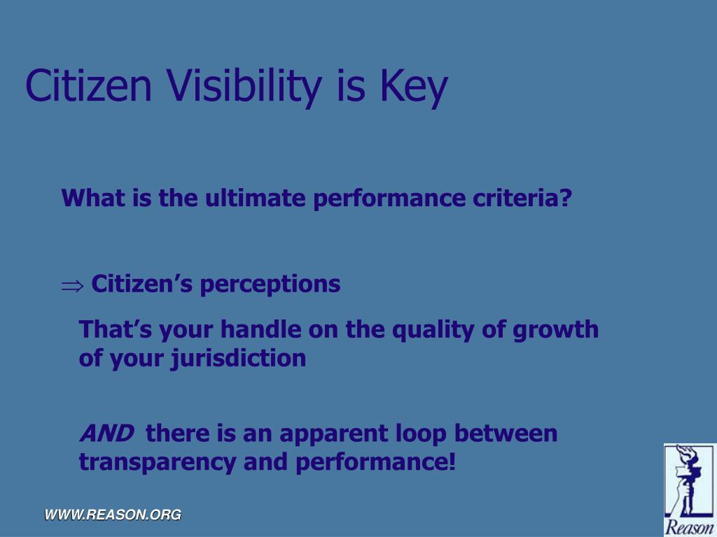 Citizen Visibility is Key What is the ultimate performance criteria? Citizen’s perceptions That’s your handle on the quality of growth of your jurisdiction AND there is an apparent loop between transparency and performance!