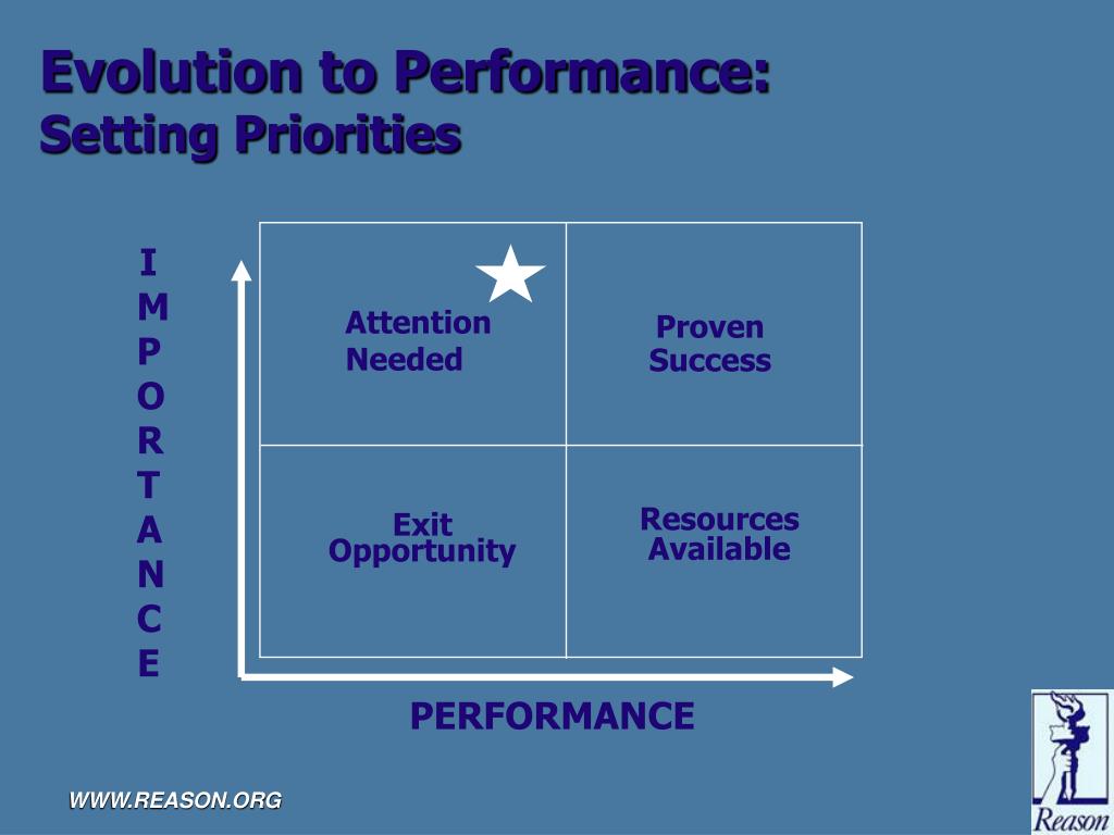 Evolution to Performance:Setting Priorities I M P O R T A N C E Proven Success Attention Needed ResourcesAvailable Exit Opportunity PERFORMANCE