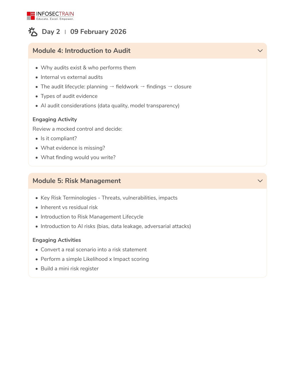 Day 2 | 09 February 2026 Module 4: Introduction to Audit Why audits exist & who performs them Internal vs external audits The audit lifecycle: planning → fieldwork → findings → closure Types of audit evidence AI audit considerations (data quality, model transparency) Engaging Activity Review a mocked control and decide: Is it compliant? What evidence is missing? What finding would you write? Module 5: Risk Management Key Risk Terminologies - Threats, vulnerabilities, impacts Inherent vs residual risk Introduction to Risk Management Lifecycle Introduction to AI risks (bias, data leakage, adversarial attacks) Engaging Activities Convert a real scenario into a risk statement Perform a simple Likelihood x Impact scoring Build a mini risk register