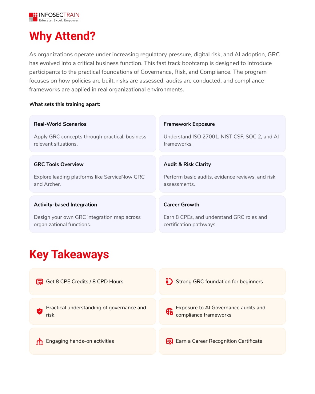 Why Attend? As organizations operate under increasing regulatory pressure, digital risk, and AI adoption, GRC has evolved into a critical business function. This fast track bootcamp is designed to introduce participants to the practical foundations of Governance, Risk, and Compliance. The program focuses on how policies are built, risks are assessed, audits are conducted, and compliance frameworks are applied in real organizational environments. What sets this training apart: Real-World Scenarios Framework Exposure Apply GRC concepts through practical, business- relevant situations. Understand ISO 27001, NIST CSF, SOC 2, and AI frameworks. GRC Tools Overview Audit & Risk Clarity Explore leading platforms like ServiceNow GRC and Archer. Perform basic audits, evidence reviews, and risk assessments. Activity-based Integration Career Growth Design your own GRC integration map across organizational functions. Earn 8 CPEs, and understand GRC roles and certification pathways. Key Takeaways Get 8 CPE Credits /8 CPDHours Strong GRC foundation for beginners Practical understanding of governance and risk Exposure to AI Governance audits and compliance frameworks Engaging hands-on activities Earn a Career Recognition Certificate
