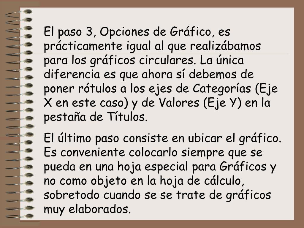 El paso 3, Opciones de Gráfico, es prácticamente igual al que realizábamos para los gráficos circulares. La única diferencia es que ahora sí debemos de poner rótulos a los ejes de Categorías (Eje X en este caso) y de Valores (Eje Y) en la pestaña de Títulos. El último paso consiste en ubicar el gráfico. Es conveniente colocarlo siempre que se pueda en una hoja especial para Gráficos y no como objeto en la hoja de cálculo, sobretodo cuando se se trate de gráficos muy elaborados.