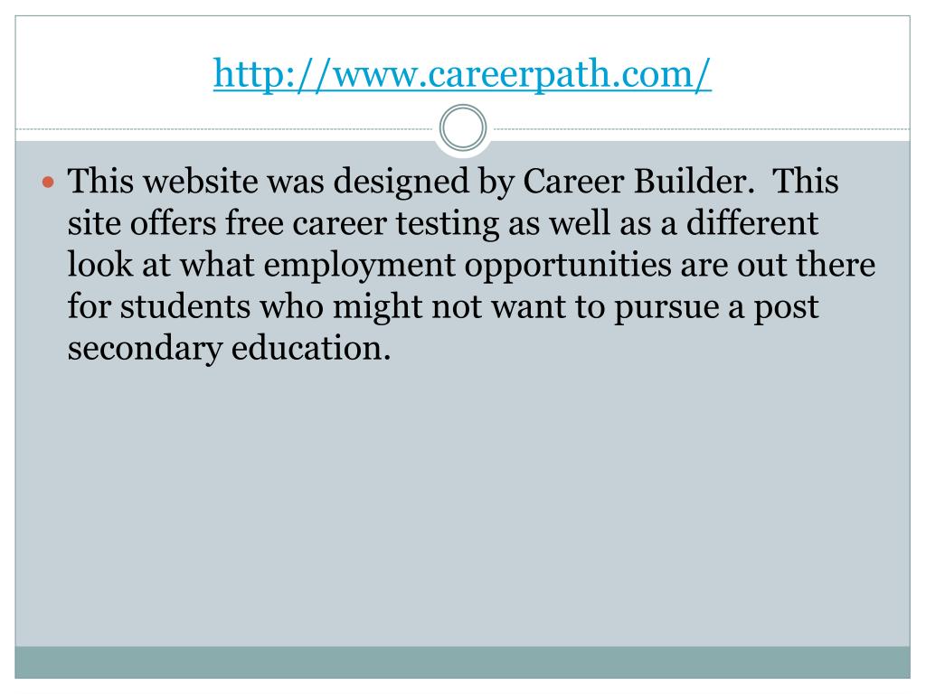 http://www.careerpath.com/ This website was designed by Career Builder. This site offers free career testing as well as a different look at what employment opportunities are out there for students who might not want to pursue a post secondary education.