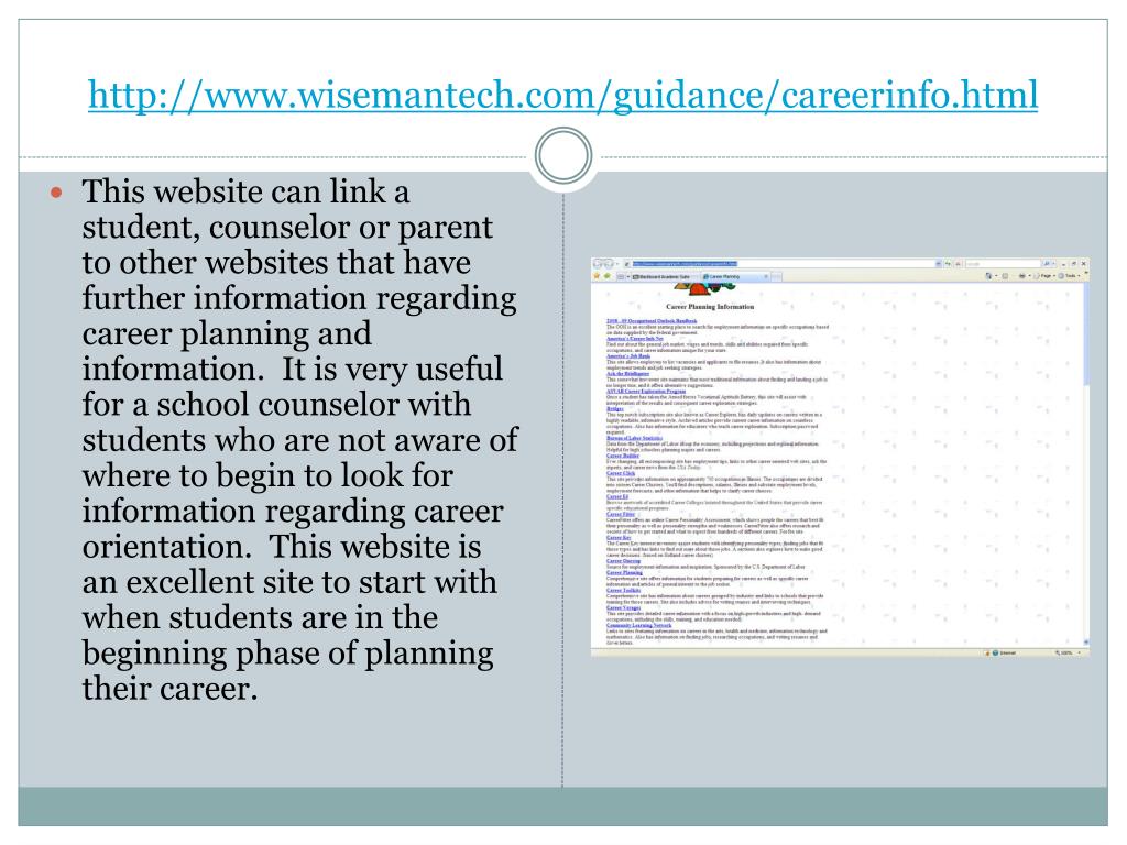 http://www.wisemantech.com/guidance/careerinfo.html This website can link a student, counselor or parent to other websites that have further information regarding career planning and information. It is very useful for a school counselor with students who are not aware of where to begin to look for information regarding career orientation. This website is an excellent site to start with when students are in the beginning phase of planning their career.