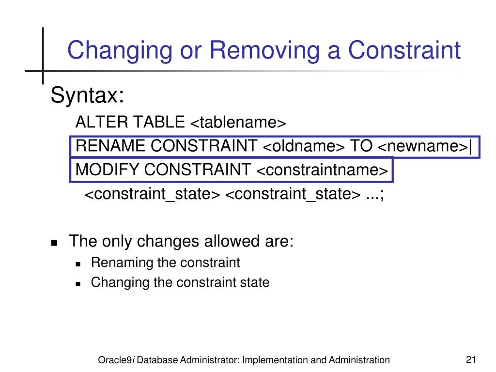 Changing or Removing a Constraint Syntax: ALTER TABLE <tablename> RENAME CONSTRAINT <oldname> TO <newname>| MODIFY CONSTRAINT <constraintname> <constraint_state> <constraint_state> ...; • The only changes allowed are: • Renaming the constraint • Changing the constraint state Oracle9i Database Administrator: Implementation and Administration
