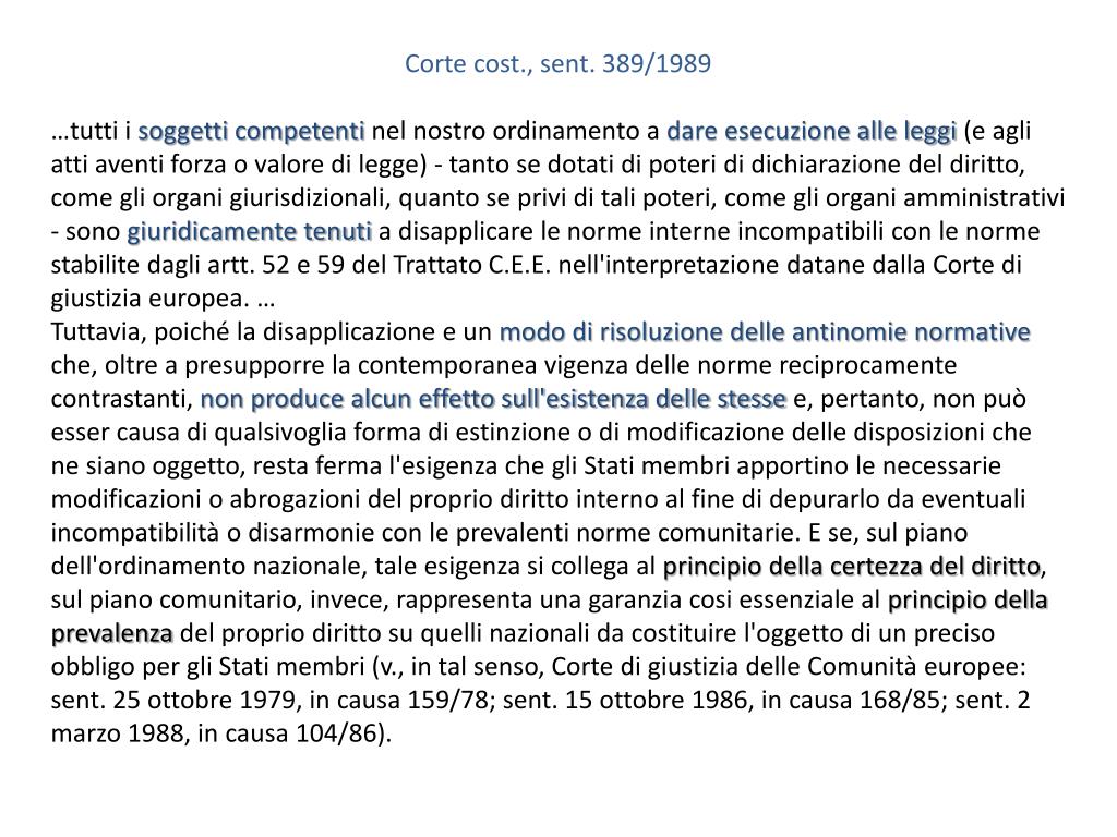 Corte cost., sent. 389/1989 …tuttii soggetti competenti nel nostro ordinamento a dare esecuzione alle leggi (e agli atti aventi forza o valore di legge) - tanto se dotati di poteri di dichiarazione del diritto, come gli organi giurisdizionali, quanto se privi di tali poteri, come gli organi amministrativi - sono giuridicamente tenuti a disapplicare le norme interne incompatibili con le norme stabilite dagli artt. 52 e 59 del Trattato C.E.E. nell'interpretazione datane dalla Corte di giustizia europea. … Tuttavia, poiché la disapplicazione e un modo di risoluzione delle antinomie normative che, oltre a presupporre la contemporanea vigenza delle norme reciprocamente contrastanti, non produce alcun effetto sull'esistenza delle stesse e, pertanto, non può esser causa di qualsivoglia forma di estinzione o di modificazione delle disposizioni che ne siano oggetto, resta ferma l'esigenza che gli Stati membri apportino le necessarie modificazioni o abrogazioni del proprio diritto interno al fine di depurarlo da eventuali incompatibilità o disarmonie con le prevalenti norme comunitarie. E se, sul piano dell'ordinamento nazionale, tale esigenza si collega al principio della certezza del diritto, sul piano comunitario, invece, rappresenta una garanzia cosi essenziale al principio della prevalenza del proprio diritto su quelli nazionali da costituire l'oggetto di un preciso obbligo per gli Stati membri (v., in tal senso, Corte di giustizia delle Comunità europee: sent. 25 ottobre 1979, in causa 159/78; sent. 15 ottobre 1986, in causa 168/85; sent. 2 marzo 1988, in causa 104/86).