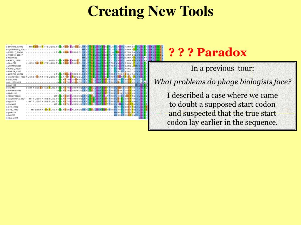 Creating New Tools ? ? ? Paradox In a previous tour: What problems do phage biologists face? I described a case where we cameto doubt a supposed start codon and suspected that the true start codon lay earlier in the sequence.