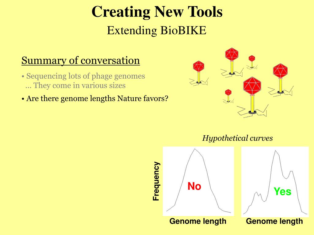 Creating New Tools Hypothetical curves Frequency No Yes Genome length Genome length Extending BioBIKE • Summary of conversation • Sequencing lots of phage genomes … They come in various sizes • Are there genome lengths Nature favors?