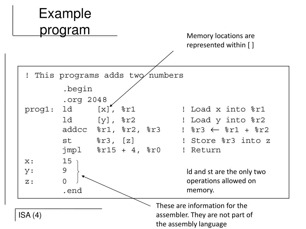 Example program Memory locations are represented within [ ] ld and st are the only two operations allowed on memory. These are information for the assembler. They are not part of the assembly language