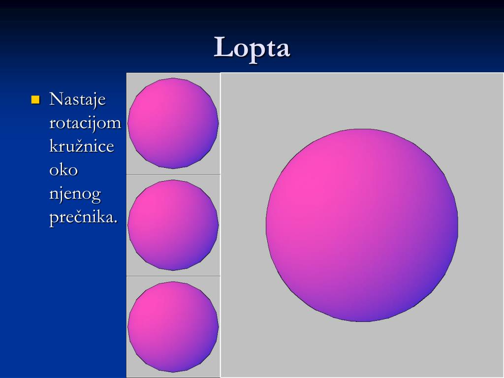 Lopta • Nastaje rotacijom kružnice oko njenog prečnika.