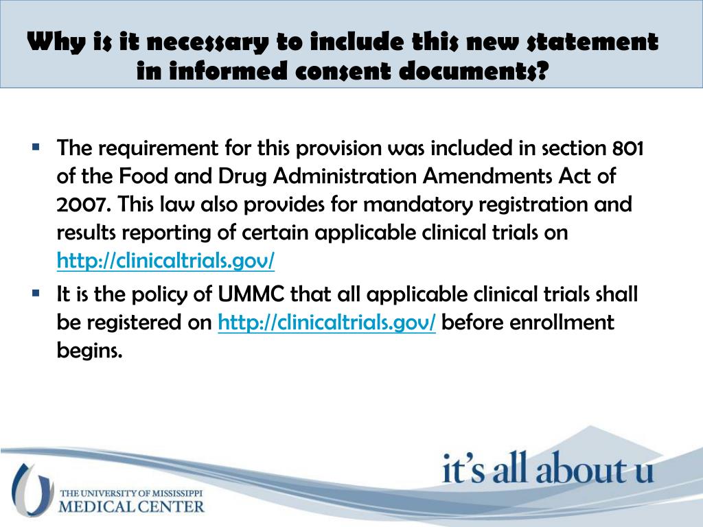Why is it necessary to include this new statement in informed consent documents? • The requirement for this provision was included in section 801 of the Food and Drug Administration Amendments Act of 2007. This law also provides for mandatory registration and results reporting of certain applicable clinical trials on http://clinicaltrials.gov/ • It is the policy of UMMC that all applicable clinical trials shall be registered on http://clinicaltrials.gov/ before enrollment begins.