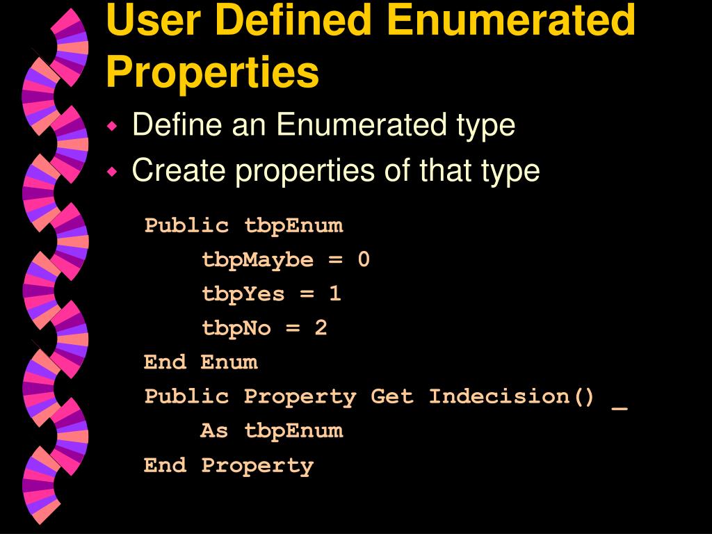 User Defined Enumerated Properties • Define an Enumerated type • Create properties of that type Public tbpEnum tbpMaybe = 0 tbpYes = 1 tbpNo = 2 End Enum Public Property Get Indecision() _ As tbpEnum End Property