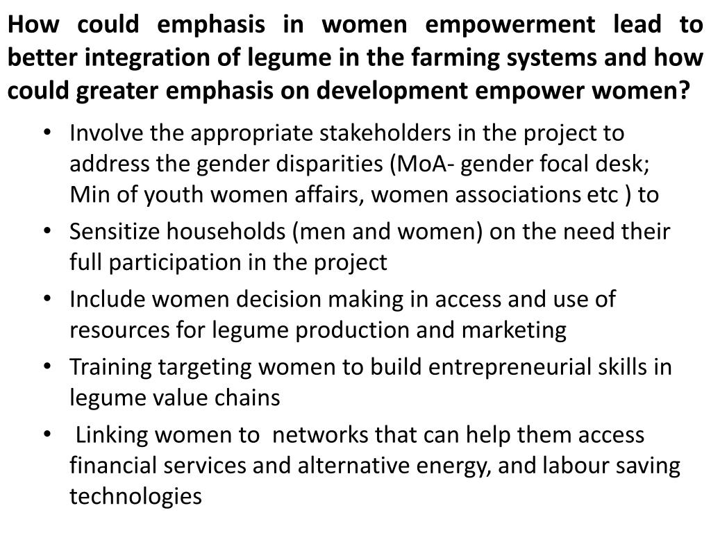 Women Empowerment. What is intersection between women empowerment and legumes in Ethiopian farming systems?. The play a key role in production and post harvest handling ( labour for weeding, harvesting, threshing) and to a limited extent in marketing. However: