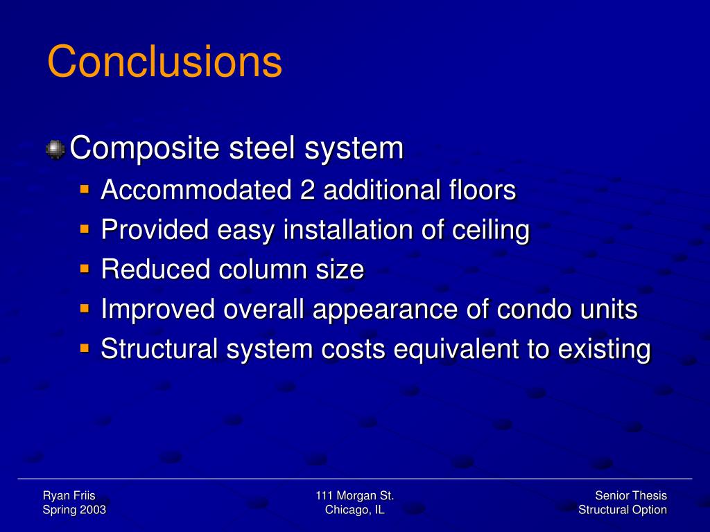 Conclusions • Composite steel system • Accommodated 2 additional floors • Provided easy installation of ceiling • Reduced column size • Improved overall appearance of condo units • Structural system costs equivalent to existing 111 Morgan St. Chicago, IL