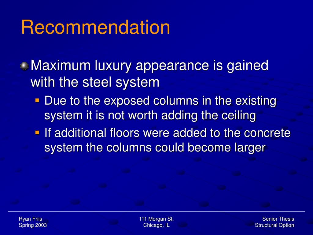 Recommendation • Maximum luxury appearance is gained with the steel system • Due to the exposed columns in the existing system it is not worth adding the ceiling • If additional floors were added to the concrete system the columns could become larger 111 Morgan St. Chicago, IL