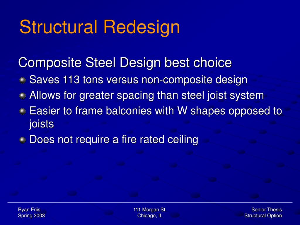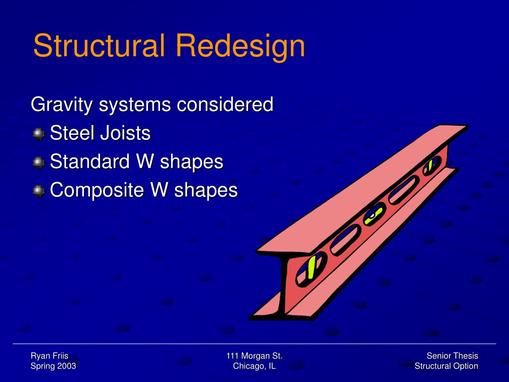 Structural Redesign Gravity systems considered • Steel Joists • Standard W shapes • Composite W shapes 111 Morgan St. Chicago, IL