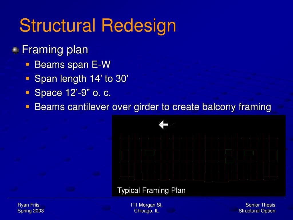 Structural Redesign • Framing plan • Beams span E-W • Span length 14’ to 30’ • Space 12’-9” o. c. • Beams cantilever over girder to create balcony framing Typical Framing Plan 111 Morgan St. Chicago, IL