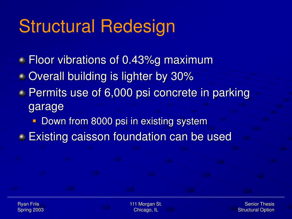 Structural Redesign • Floor vibrations of 0.43%g maximum • Overall building is lighter by 30% • Permits use of 6,000 psi concrete in parking garage • Down from 8000 psi in existing system • Existing caisson foundation can be used 111 Morgan St. Chicago, IL