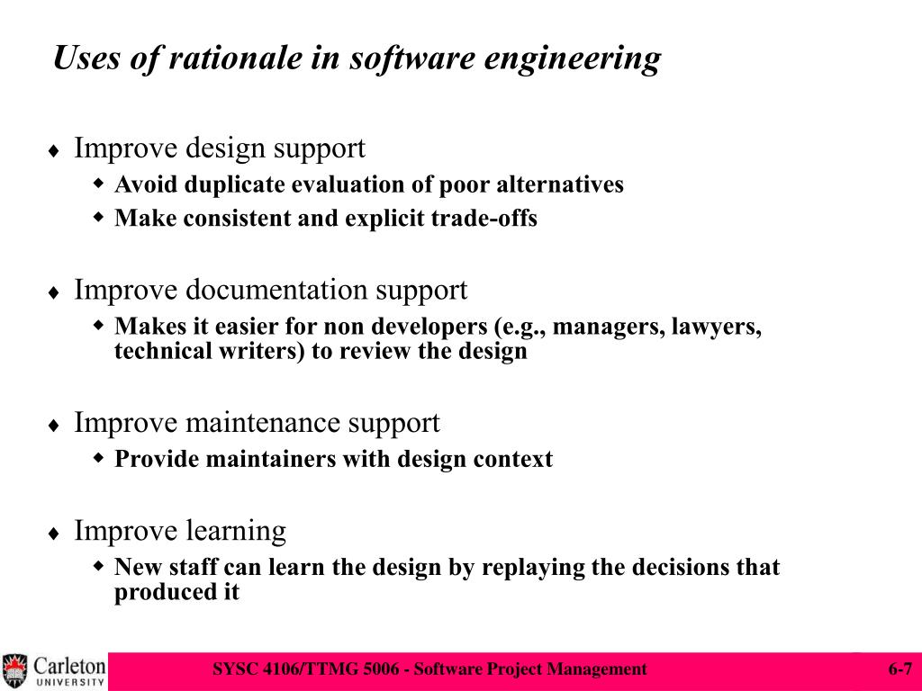 Uses of rationale in software engineering • Improve design support • Avoid duplicate evaluation of poor alternatives • Make consistent and explicit trade-offs • Improve documentation support • Makes it easier for non developers (e.g., managers, lawyers, technical writers) to review the design • Improve maintenance support • Provide maintainers with design context • Improve learning • New staff can learn the design by replaying the decisions that produced it