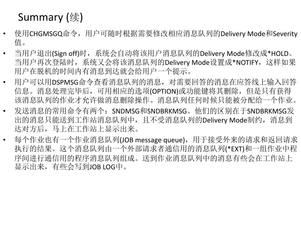 Summary (续) • 使用CHGMSGQ命令,用户可随时根据需要修改相应消息队列的Delivery Mode和Severity值。 • 当用户退出(Sign off)时,系统会自动将该用户消息队列的Delivery Mode修改成*HOLD。当用户再次登陆时,系统又会将该消息队列的Delivery Mode设置成*NOTIFY,这样如果用户在脱机的时间内有消息到达就会给用户一个提示。 • 用户可以用DSPMSG命令查看消息队列的消息,对需要回答的消息在应答线上输入回答信息。消息处理完毕后,可用相应的选项(OPTION)或功能键将其删除,但是只有获得该消息队列的作业才允许做消息删除操作。消息队列任何时候只能被分配给一个作业。 • 发送消息的常用命令有两个:SNDMSG和SNDBRKMSG。他们的区别在于SNDBRKMSG发出的消息只能送到工作站消息队列中,且不受消息队列的Delivery Mode制约,消息到达对方后,马上在工作站上显示出来。 • 每个作业也有一个作业消息队列(JOB message queue),用于接受外来的请求和返回请求执行的结果。这个消息队列由一个外部请求者通信用的消息队列(*EXT)和一组作业中程序间进行通信用的程序消息队列组成。送到作业消息队列中的消息有些会在工作站上显示出来,有些会写到JOB LOG中。