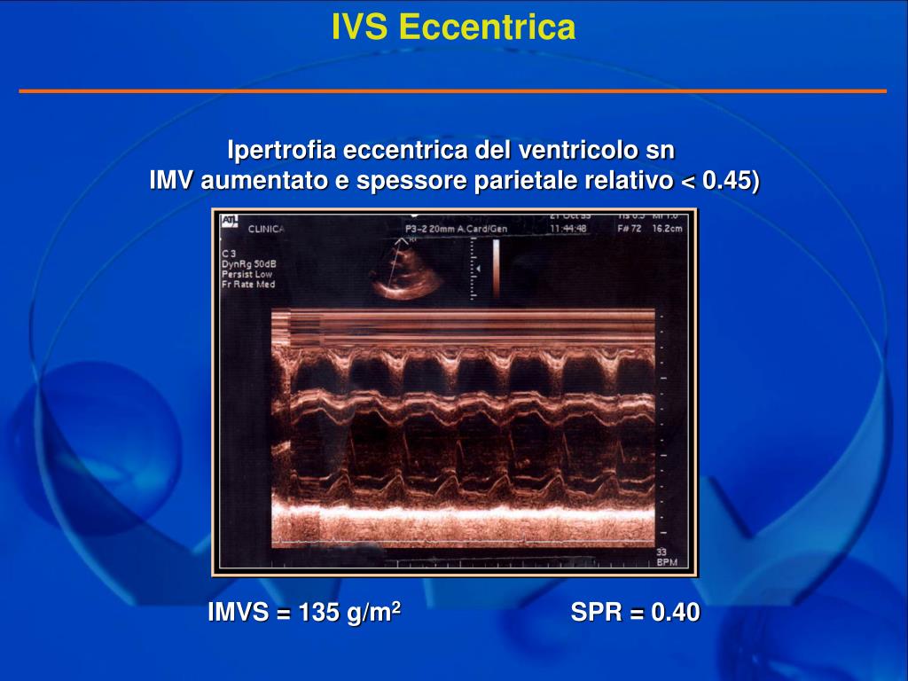 IVS Eccentrica Ipertrofia eccentrica del ventricolo sn IMV aumentato e spessore parietale relativo < 0.45) IMVS = 135 g/m2 SPR = 0.40