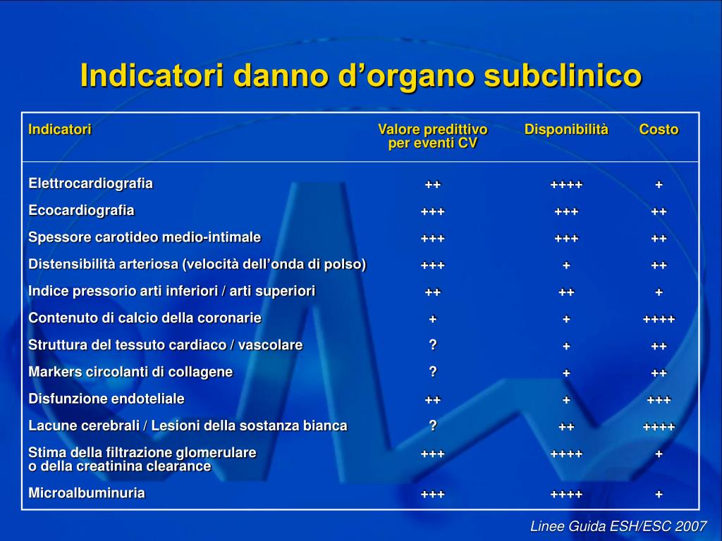 Indicatori danno d’organo subclinico Indicatori Elettrocardiografia Ecocardiografia Spessore carotideo medio-intimale Distensibilità arteriosa (velocità dell’onda di polso) Indice pressorio arti inferiori / arti superiori Contenuto di calcio della coronarie Struttura del tessuto cardiaco / vascolare Markers circolanti di collagene Disfunzione endoteliale Lacune cerebrali / Lesioni della sostanza bianca Stima della filtrazione glomerulare o della creatinina clearance Microalbuminuria Valore predittivo per eventi CV ++ +++ +++ +++ ++ + ? ? ++ ? +++ +++ Disponibilità ++++ +++ +++ + ++ + + + + ++ ++++ ++++ Costo + ++ ++ ++ + ++++ ++ ++ +++ ++++ + + Linee Guida ESH/ESC 2007