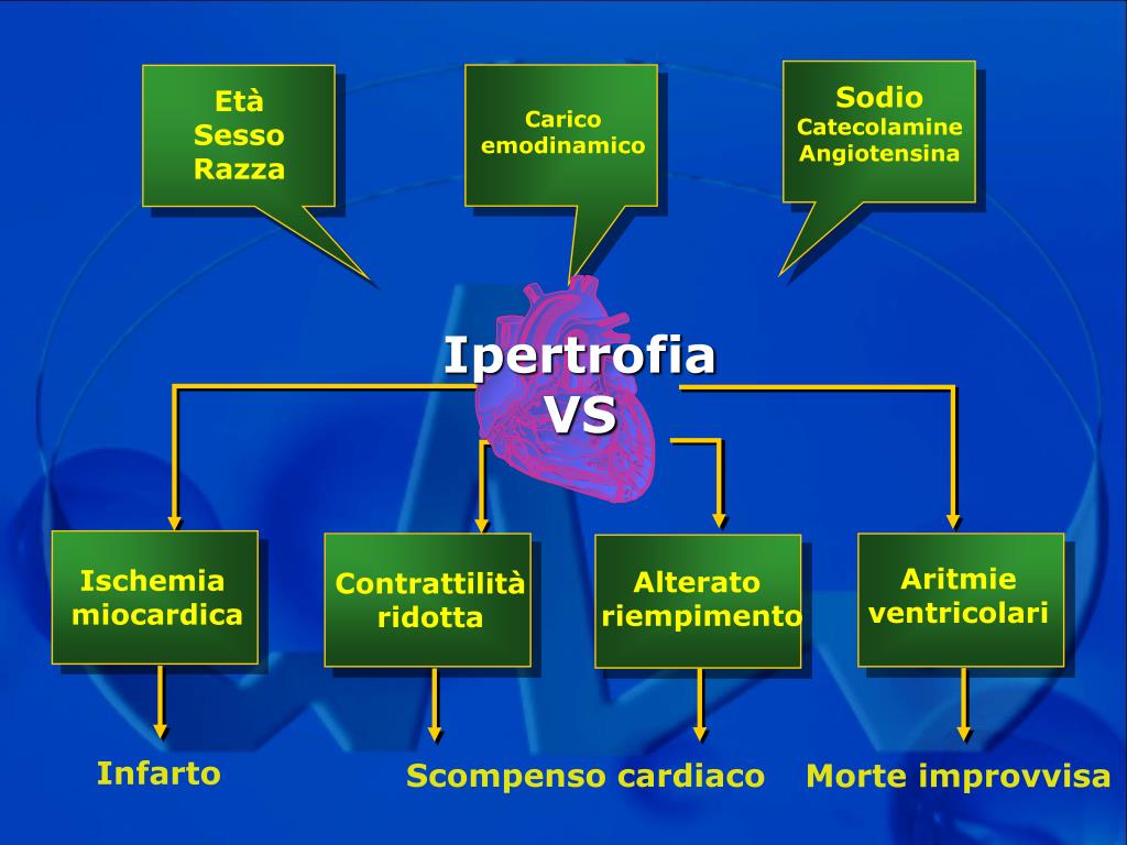 Sodio Catecolamine Angiotensina Età Sesso Razza Carico emodinamico Ipertrofia VS Aritmie ventricolari Ischemia miocardica Alterato riempimento Contrattilità ridotta Infarto Scompenso cardiaco Morte improvvisa