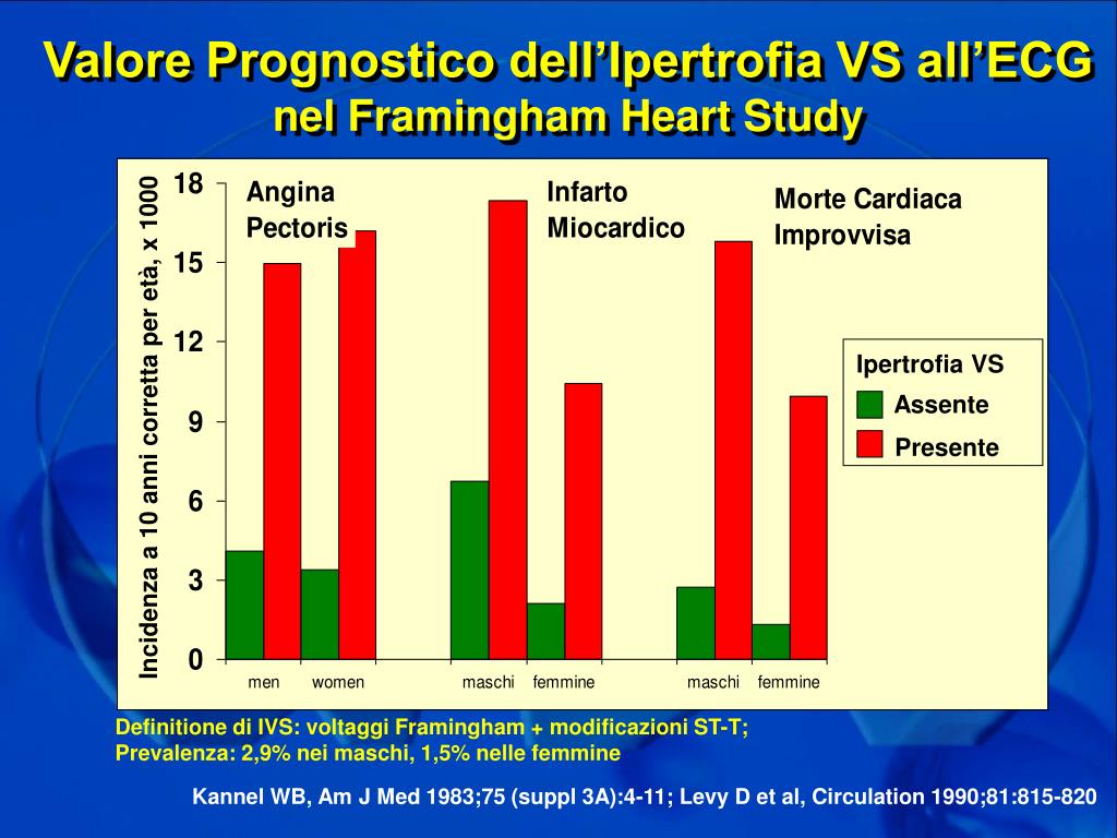Valore Prognostico dell’Ipertrofia VS all’ECG nel Framingham Heart Study Ipertrofia VS Assente Incidenza a 10 anni corretta per età, x 1000 Presente • Definitione di IVS: voltaggi Framingham + modificazioni ST-T; • Prevalenza: 2,9% nei maschi, 1,5% nelle femmine Kannel WB, Am J Med 1983;75 (suppl 3A):4-11; Levy D et al, Circulation 1990;81:815-820