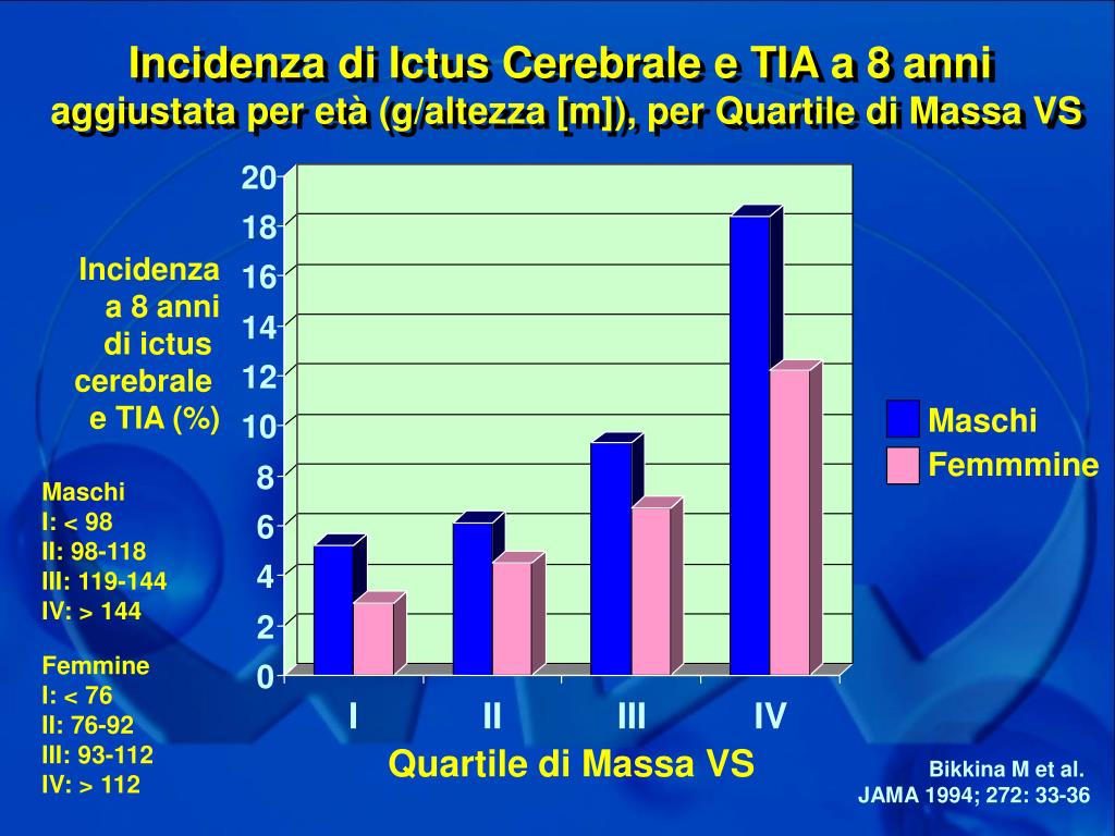 Incidenza di Ictus Cerebrale e TIA a 8 anni aggiustata per età (g/altezza [m]), per Quartile di Massa VS 20 18 Incidenza a 8 anni di ictus cerebrale e TIA (%) 16 14 12 Maschi 10 Femmmine 8 Maschi I: < 98 II: 98-118 III: 119-144 IV: > 144 6 4 2 Femmine I: < 76 II: 76-92 III: 93-112 IV: > 112 0 I II III IV Quartile di Massa VS Bikkina M et al. JAMA 1994; 272: 33-36